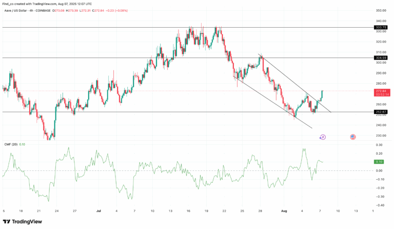 On the 4-hour chart, AAVE has broken out of a descending channel — a pattern that often marks the end of a downtrend and the start of upward momentum. Buyers are regaining control, supported by a rising Chaikin Money Flow (CMF) indicator that has crossed above zero, signaling increasing buying pressure and institutional interest.