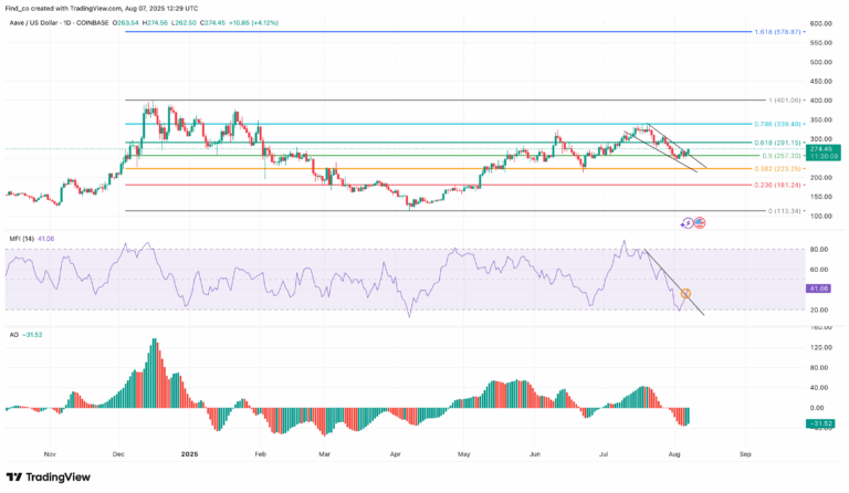If this momentum holds, AAVE could target interim resistance levels at $304.59 and $333.75 on its way back up. The daily chart confirms this bullish setup, showing a breach above a key resistance trendline. Additional indicators like the Money Flow Index (MFI) rebounding from oversold territory and the Awesome Oscillator (AO) printing green bars further support the case for a sustained recovery.