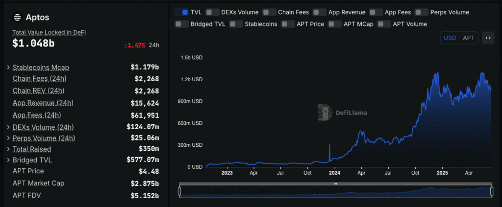 Despite increased short-term trading, Aptos’s total value locked (TVL) declined by nearly 6%, signaling a withdrawal of long-term capital. This trend contrasts sharply with the continued rise in smart contract deployments, which topped 450 daily. Developer interest remains strong, showing confidence in the chain’s long-term potential, even as investors grow cautious.