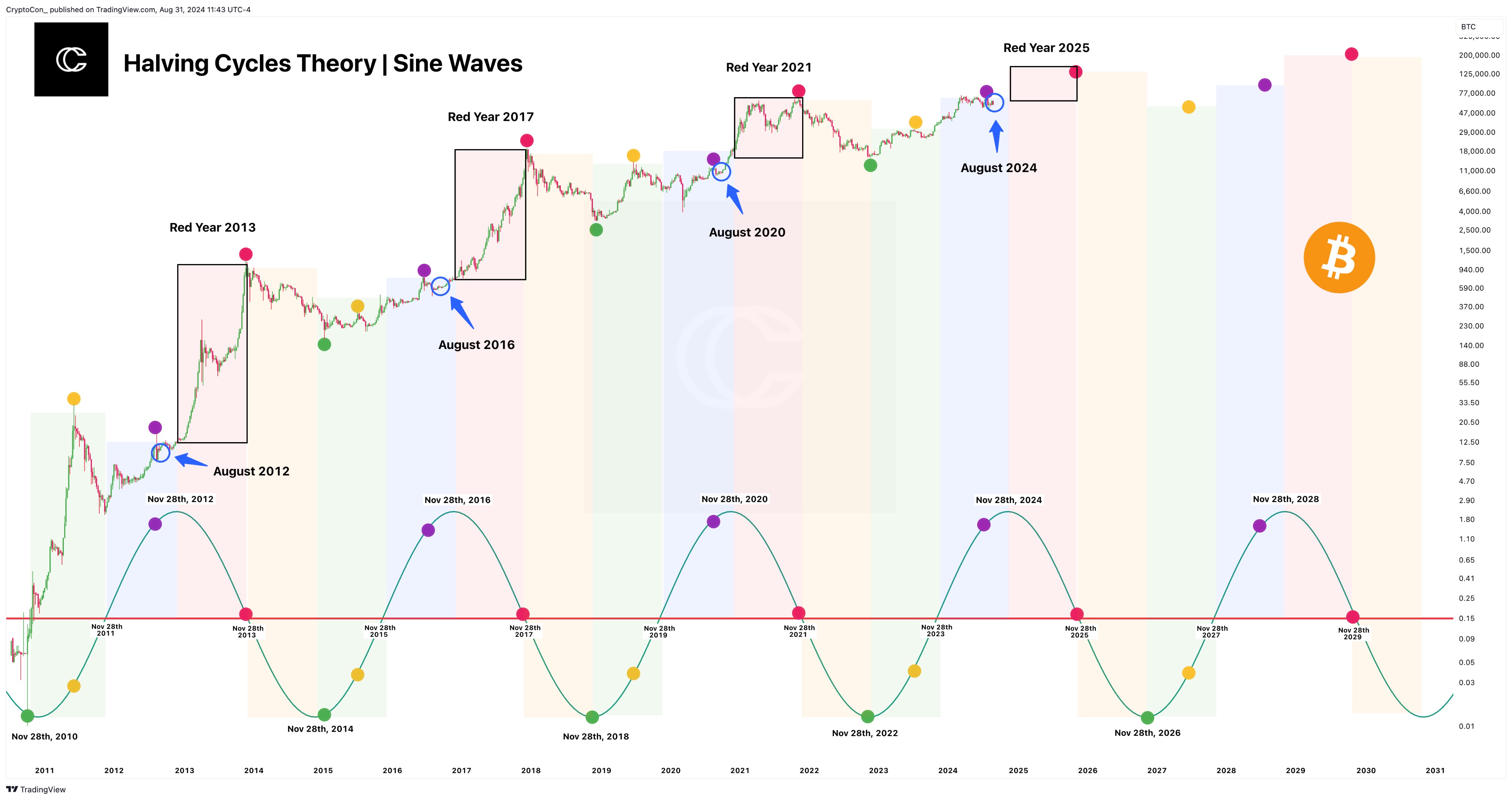 CryptoCon has offered a broader perspective on Bitcoin’s price action, suggesting that the current phase is typical of the end of a “Blue Year.” August has historically been a month of stagnation before major rallies, as evidenced by the years 2012, 2016, and 2020.
