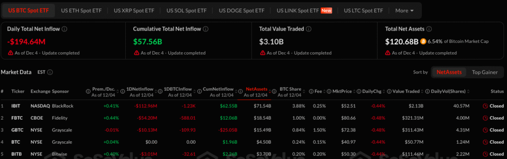 According to data from SoSoValue, U.S. spot bitcoin ETFs posted $194.6 million in net outflows, marking the largest daily withdrawal since Nov. 20. BlackRock’s IBIT, typically one of the most stable performers, led the exodus with $112.9 million leaving the fund. Fidelity’s FBTC followed with $54.2 million in outflows, while VanEck’s HODL, Grayscale’s GBTC, and Bitwise’s BITB also saw redemptions.