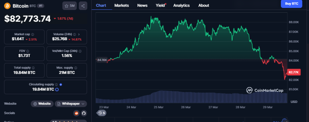 Data from TradingView highlights a consistent bullish trend between March 17 and March 25. Bitcoin’s price remains above $83,000, supported by small-bodied candles and minimal selling pressure. The volume indicator shows rising market participation, reinforcing strong bullish confidence.