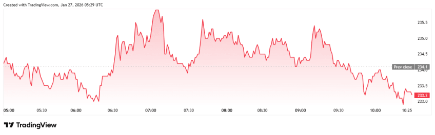 At the time of writing, TAO is trading near $233, showing little change over the past 24 hours. Daily trading volume stands at roughly $165 million, while market capitalization is around $2.48 billion, reflecting subdued but steady participation as the market waits for direction.