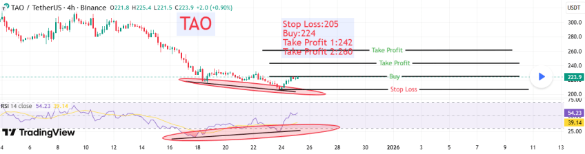 This setup does not guarantee a reversal, but it does suggest bears may be losing control. If buyers step in with conviction, TAO could attempt a gradual move higher, starting with a push toward the $242 area, followed by a retest of $260 if momentum strengthens.