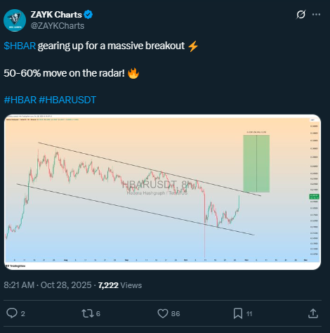 The network’s recognition is growing beyond the crypto community. Hedera supports FRNT, Wyoming’s first state-backed stablecoin, demonstrating adoption in public finance. Analysts are bullish on HBAR’s potential: popular crypto strategist Zayk forecasts a 50–60% upside if current momentum continues.