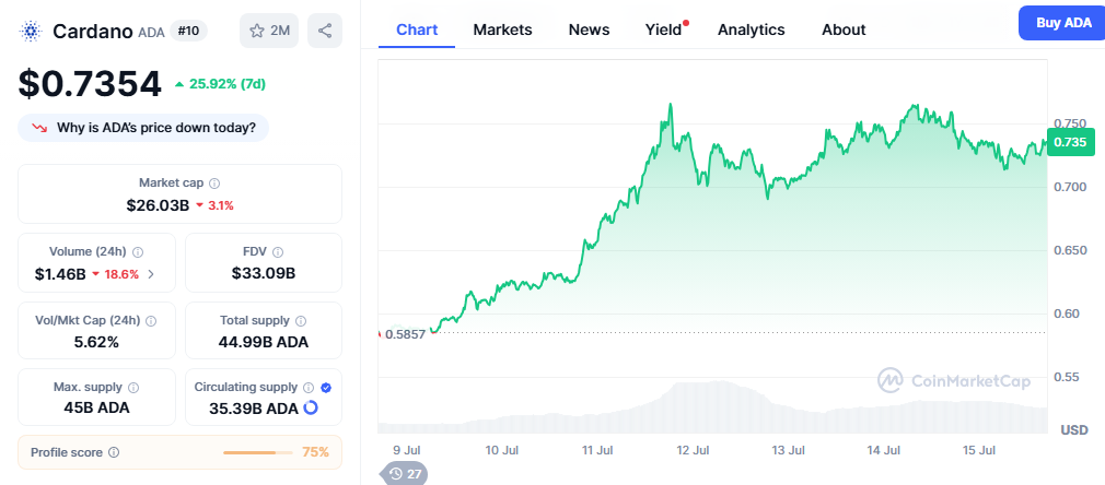 As of writing, ADA is trading at $0.7363, with a 24-hour trading volume of $1.82 billion, reflecting a 23.85% surge. Its market capitalization now stands at $26.01 billion, signaling renewed investor confidence.