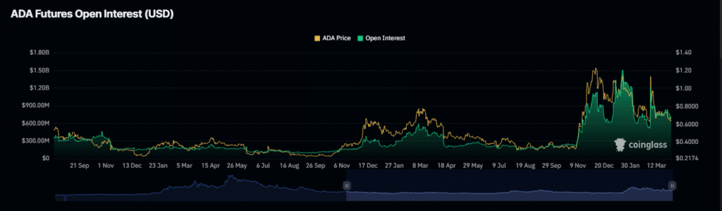 Market sentiment has further been reinforced by the long-to-short ratio, which currently sits at 0.9767. This ratio suggests more selling than buying, a key indicator that ADA’s price may continue to trend downward unless the metric shifts above 1, indicating stronger buying interest.