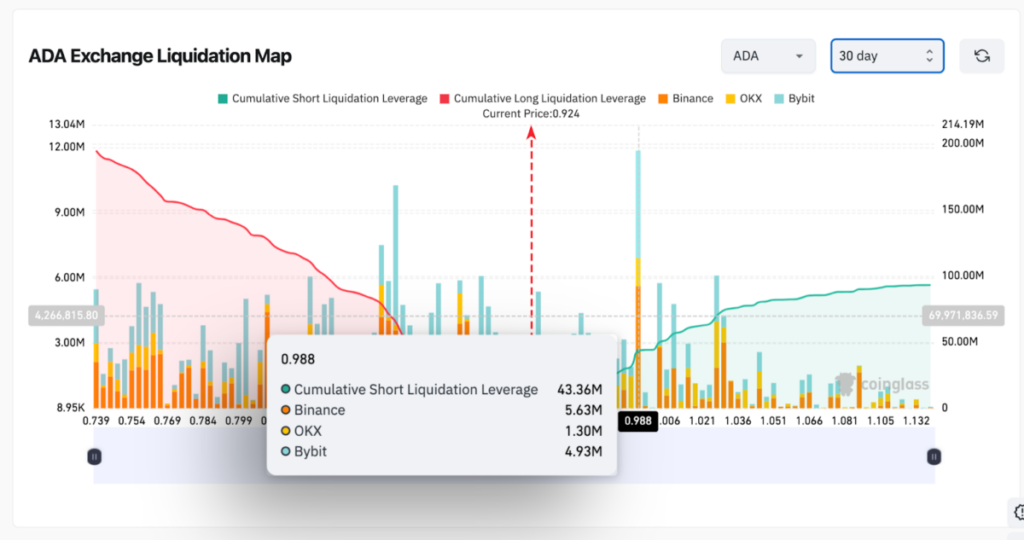 However, ADA faces a critical resistance cluster at $0.98, where roughly $43 million in short positions are concentrated. This explains why the intraday rebound stalled at $0.97, creating a significant overhead barrier. A successful break above this level could trigger short-covering, potentially driving ADA toward $1.20.