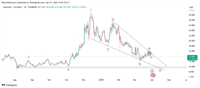 The wave count analysis suggests that LINK is in the final stages of a five-wave decline that began after its December 2024 high. Last week’s rejection confirmed the formation of a descending wedge rather than a parallel channel, signaling that the downward trend could intensify.