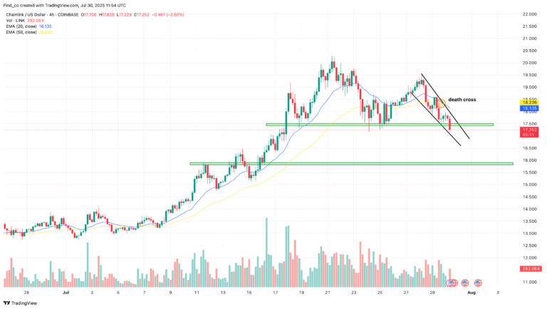 After briefly joining the broader altcoin rally in early July, LINK has since fallen into a descending price channel. On the 4-hour chart, a “death cross” has emerged — where the 20-period Exponential Moving Average (EMA) crosses below the 50 EMA — suggesting sustained downward pressure.