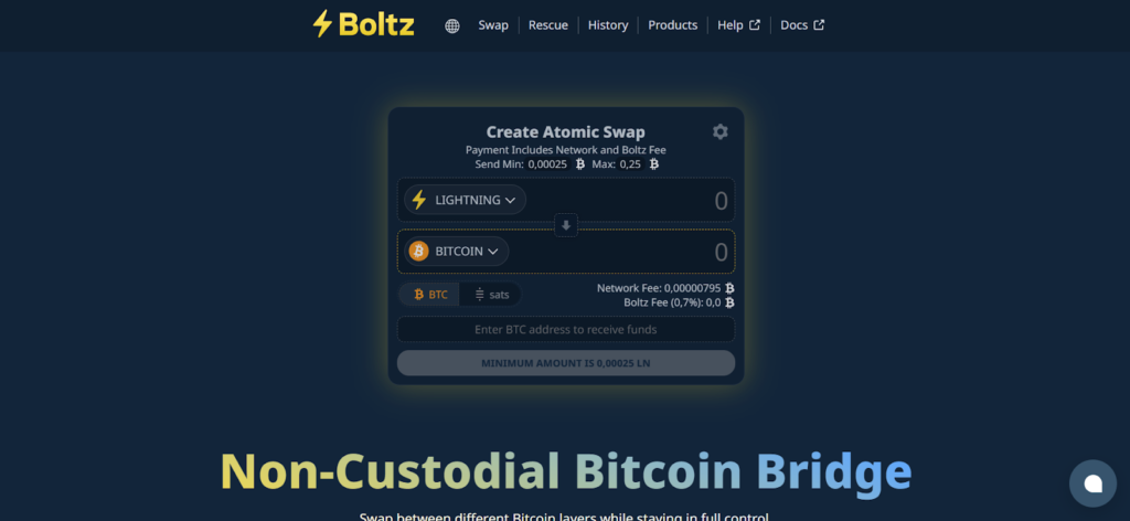 Boltz delivers the lowest fees for swapping between Bitcoin layers through trustless atomic swaps. This non-custodial platform enables seamless exchanges between on-chain Bitcoin, Lightning Network, and Liquid Network without surrendering custody of your funds. Users maintain complete control throughout the entire swap process.
