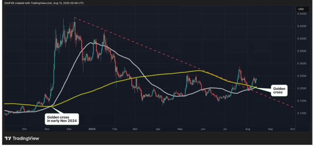 The ‘Golden Cross’ pattern appears when a short-term moving average overtakes a long-term moving average—in Dogecoin’s case, the 50-day simple moving average (SMA) crossing above the 200-day SMA. Historically, this pattern has preceded some of DOGE’s strongest rallies. For instance, after the Golden Cross on November 6, 2024, Dogecoin surged over 130% within four weeks. Another crossover on November 22, 2023, resulted in a 25% gain in the same timeframe.