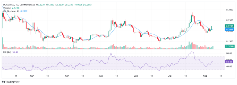 DOGE’s market capitalization now stands at $33.53 billion, with 24-hour trading volume soaring 146.64% to $2.94 billion. Analysts note a solid support level at $0.220, while immediate resistance is forming between $0.222 and $0.224.
