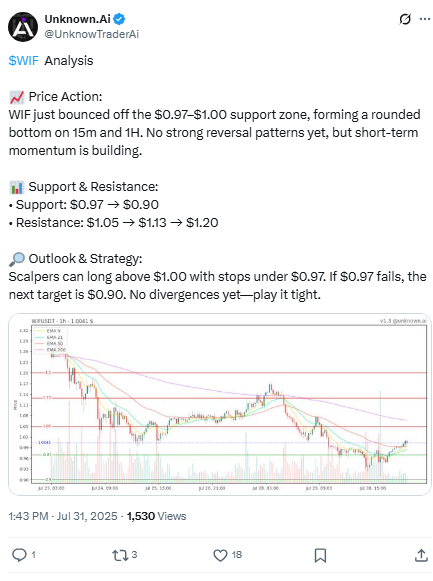 WIF now faces immediate resistance levels at $1.05, $1.13, and $1.20. On the downside, holding above $0.97 and $0.90 is key. A breach below $0.90 would likely trigger caution among bulls.