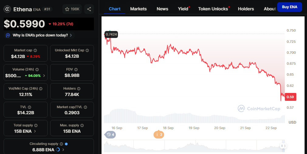 The cryptocurrency market appears set for a broad correction this week, with most altcoins trading lower. Ethena’s ENA token is no exception, slipping around 1.6% in the past 24 hours, while trading volume dropped sharply. Yet, beneath the short-term weakness, ENA’s fundamentals continue to show resilience.