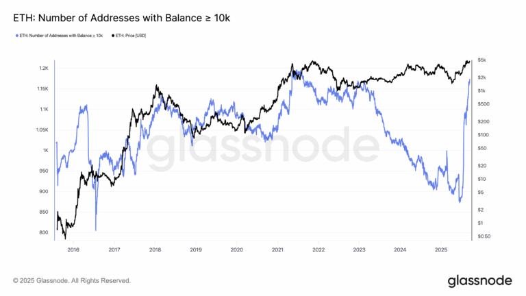Glassnode data shows that addresses holding over 10,000 ETH—the so-called whales—have surged to levels not seen since February 2023. Whale accumulation historically precedes major rallies, suggesting a potential tightening of supply that could amplify price gains.