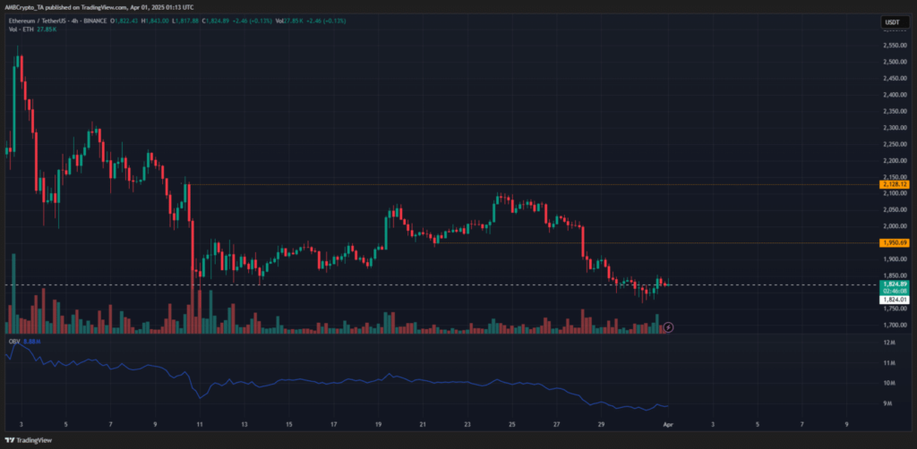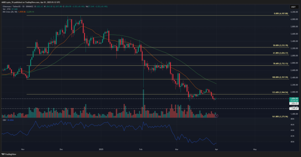 As ETH struggles to find stability, analysts are eyeing the next key support levels at $1,824 and $1,550—both of which held strong in October and November 2023. With Ethereum closing below $1,824 in a recent daily trading session, bears appear to have the upper hand. The $1,850 zone, which previously acted as support in mid-March, has now flipped into resistance, reinforcing the bearish outlook.