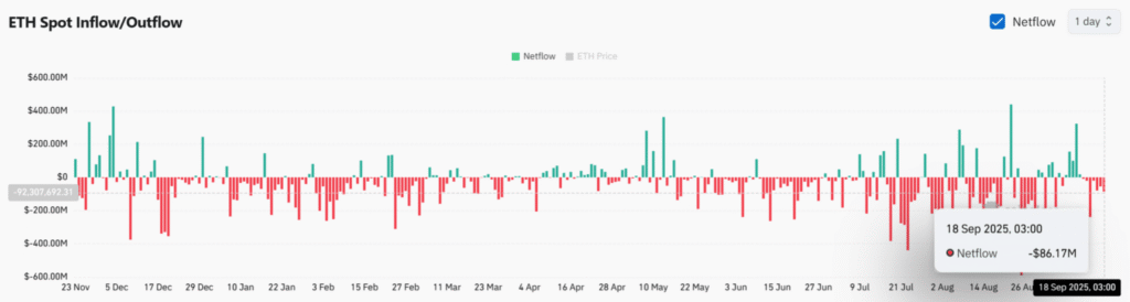 On September 18, Ethereum recorded $86.17 million in net outflows from spot exchanges. This sharp shift suggests investors prefer self-custody over keeping ETH on centralized exchanges for quick trades. Reduced supply on exchanges can heighten volatility but often supports price during demand surges, adding to the bullish structure forming post-Fed cut.