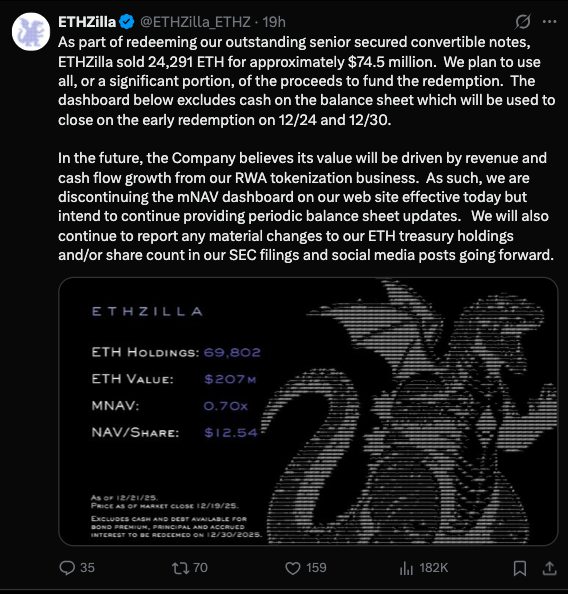 • ETHzilla sold $74.5M in ETH to repay debt and improve liquidity.
