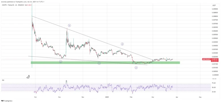 Following this, HMSTR experienced a decisive breakout from the descending triangle, suggesting an end to the correction phase. The token is now consolidating above the triangle’s upper boundary, with RSI climbing above neutral territory—signaling increasing momentum.