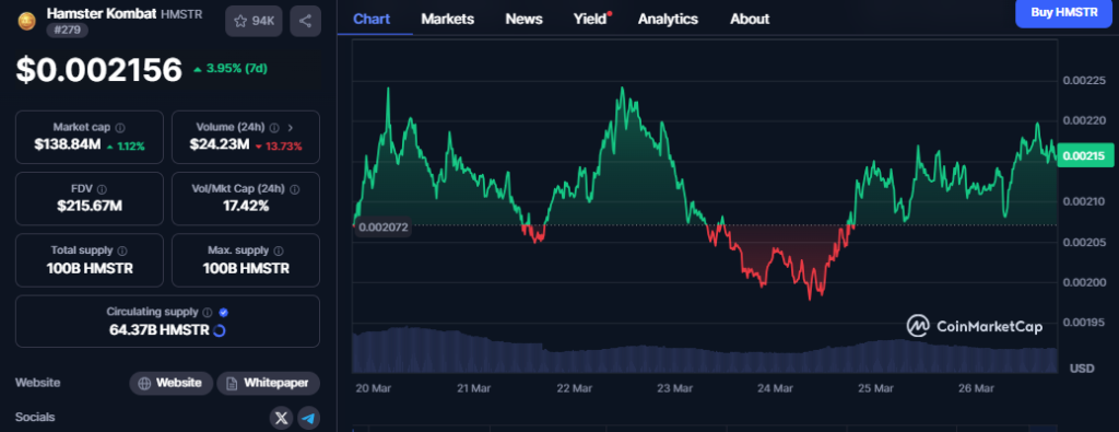 The RSI remains in mid-range, indicating room for further price appreciation. Presently, HMSTR is hovering around $0.00216, supported by a local cluster between $0.00201 (0.236 retracement) and $0.00187 (0.5 retracement).