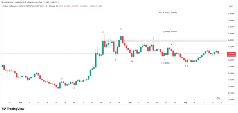 Technical analysis using wave counts shows that Hedera has completed a W-X-Y correction and appears to have bottomed. If the wave count plays out as expected, HBAR could reach $0.365, aligning with the 1.61 external Fibonacci retracement level of its recent decline.
