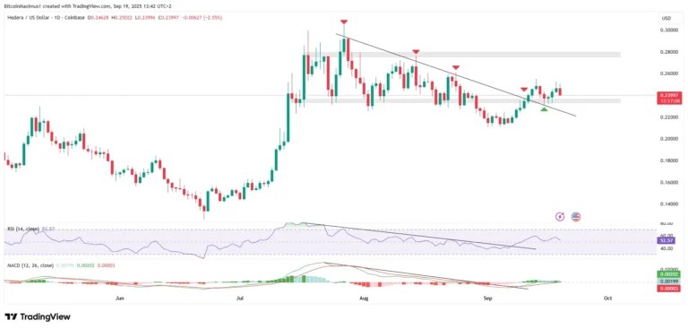 After peaking at $0.305 on July 27, HBAR fell to a low of $0.210 on September 4, breaching the $0.235 support level. However, the decline was short-lived. By September 15, Hedera had reclaimed the $0.235 area and confirmed it as support, signaling the end of its corrective phase.