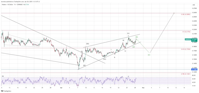Zooming into the 1-hour chart offers a more granular perspective. HBAR completed a five-wave impulse move on April 25th, reaching $0.20, before experiencing a sharp decline to $0.185, identified as wave (a) of a corrective move. The subsequent rally appears to be wave (b) of this correction, with the price currently hovering around $0.197. Analysts anticipate that wave (b) is nearing its end, suggesting that wave (c) to the downside could soon materialize. This expected pullback is likely to target the $0.176–$0.165 range, aligning with typical corrective patterns in the early stages of a bullish trend.