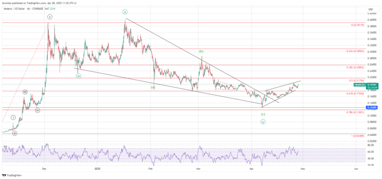 On the 4-hour chart, HBAR’s price action reveals the completion of a clear WXY correction, culminating in a significant breakout from a descending wedge pattern. The final leg of this correction, labeled as wave (c) of Y, reached a low of $0.126 on April 7th, finding support just above the 0.786 Fibonacci retracement level of a larger bullish wave. This level is often considered a key area where buying pressure can emerge, signaling the potential end of a corrective phase.