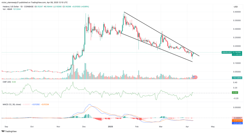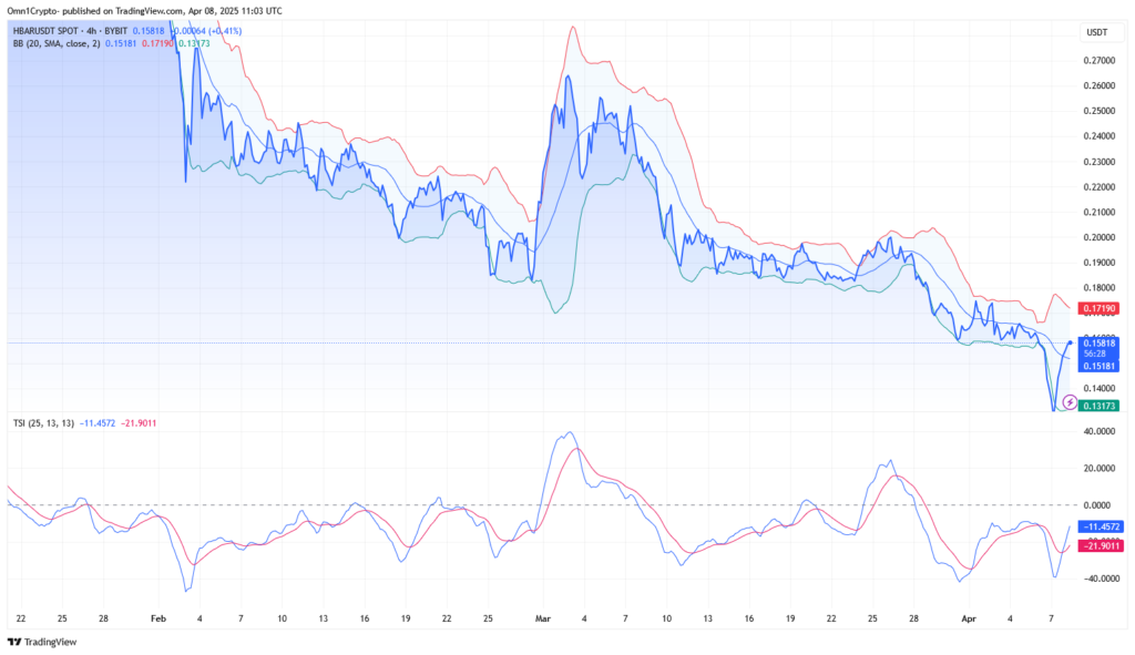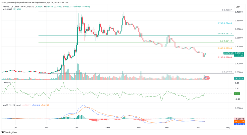 Hedera (HBAR) has made an impressive comeback, with its price soaring by 15% in the past 24 hours. On April 7, HBAR’s price surged to $0.13, and today it has reached $0.16, aligning with the broader altcoin market rally. However, despite this uptick, technical indicators suggest that HBAR may face resistance that could limit its further rise.