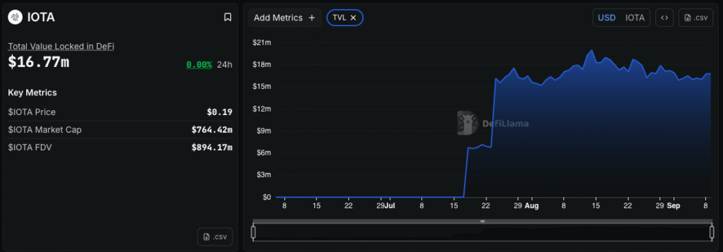 This growing recognition is already reflected in IOTA’s ecosystem. The network’s Total Value Locked (TVL) has risen to $16 million, supported by its “Rebased” upgrade, staking incentives, and a surge in DeFi activity.