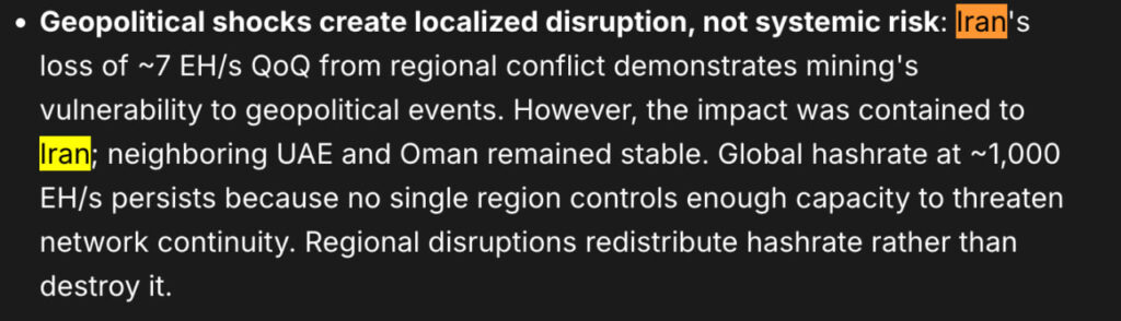 - Broader hashrate decline is driven more by falling Bitcoin prices than geopolitics.