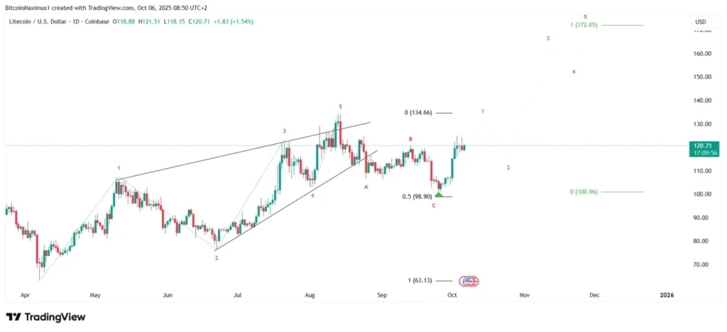 Shorter time frames reinforce the bullish outlook. Technical analysis indicates that Litecoin has completed an A-B-C correction near the $99 Fibonacci retracement level, bouncing impulsively since then. This pattern hints at the start of a new five-wave upward movement, with an initial target of $172 before a potential retracement.