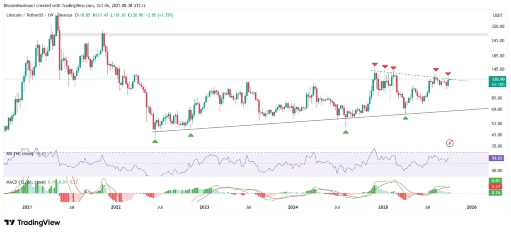 LTC/USDT Weekly Chart | Credit: Valdrin Tahiri/ TradingView