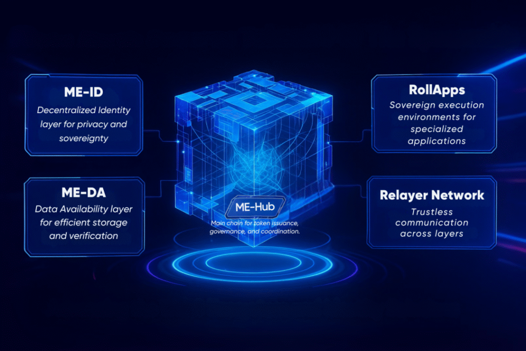 • ME Hub: primary settlement, global consensus, and $MEC issuance.