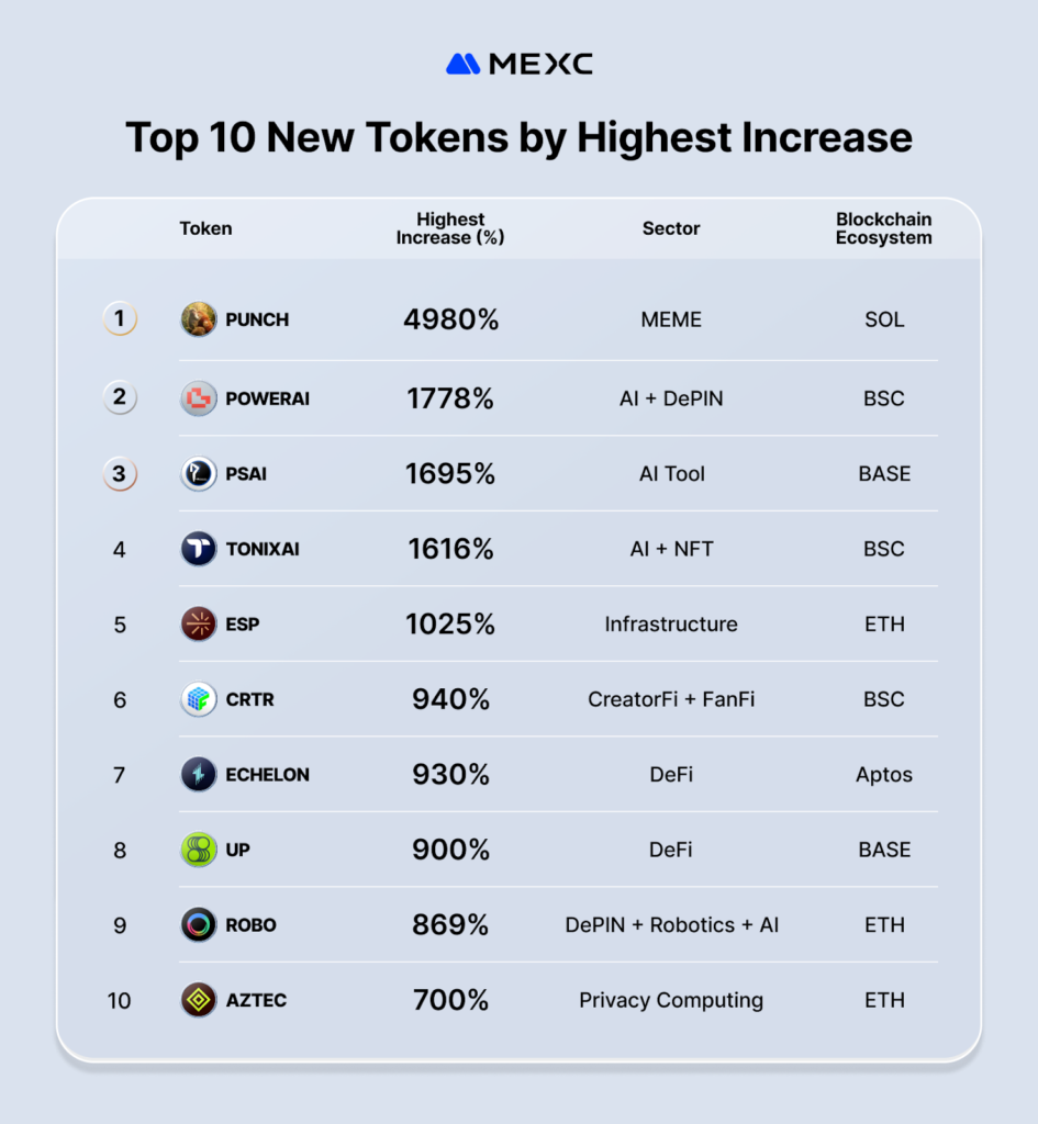 In February, MEXC’s top 10 newly listed tokens by spot trading volume averaged a peak gain of 1,367%. AI and infrastructure projects were well represented: POWERAI (+1,778%), PSAI (+1,695%), TONIXAI (+1,616%), and ESP(+1,025%) led the volume rankings, with privacy computing tokens ZAMA and AZTEC and DeFi protocol ECHELON(+930%) rounding out a list that skewed heavily toward technical and infrastructure assets.