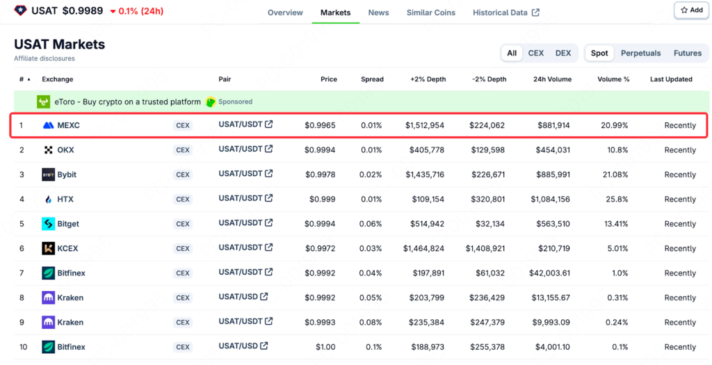 According to CoinGecko data as of February 27, 2026, MEXC ranked first in USAT spot market liquidity, recording a +2% buy depth of $1,512,954 and a bid-ask spread of just 0.01%, reflecting a liquidity structure that outperforms major exchanges. As the first exchange to list USAT, MEXC provides industry-leading trading depth and liquidity for the asset.