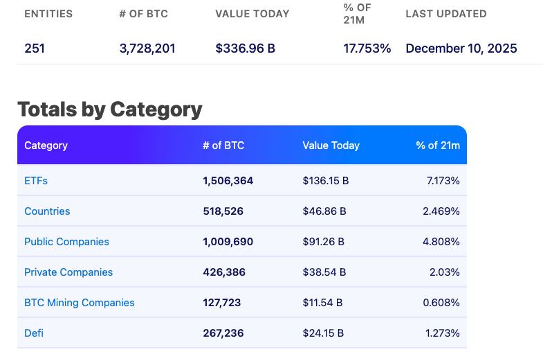 Today, public companies, governments, and ETFs collectively hold more than 3.7 million BTC, worth over $336 billion, according to Bitbo.