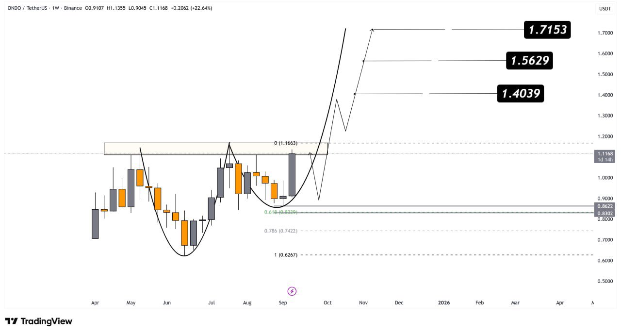 Crypto analyst BitMonty highlighted a classic cup and handle pattern forming on ONDO’s weekly chart — a historically bullish technical setup. He noted that “momentum is building” as the token attempts to flip resistance into support.