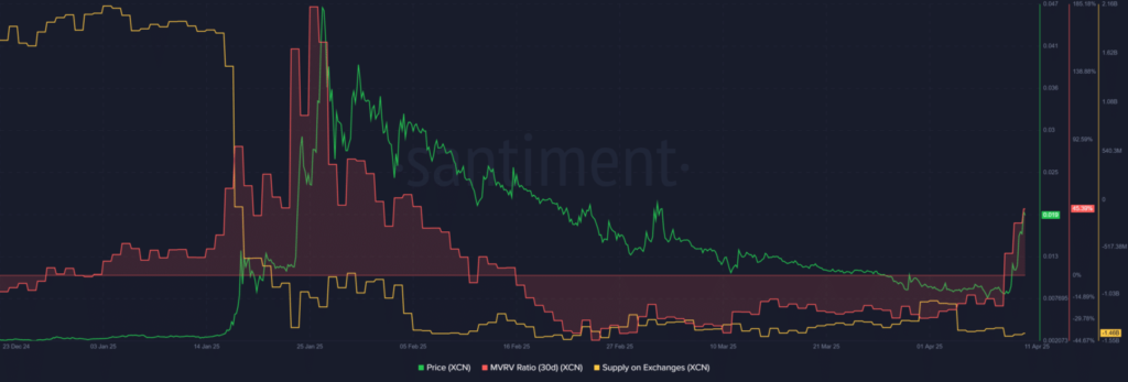 Despite this, data showed limited sell pressure. Santiment’s “Supply on Exchanges” metric revealed a decline in tokens available for trading, suggesting that most XCN holders are withdrawing their coins from exchanges rather than preparing to sell.