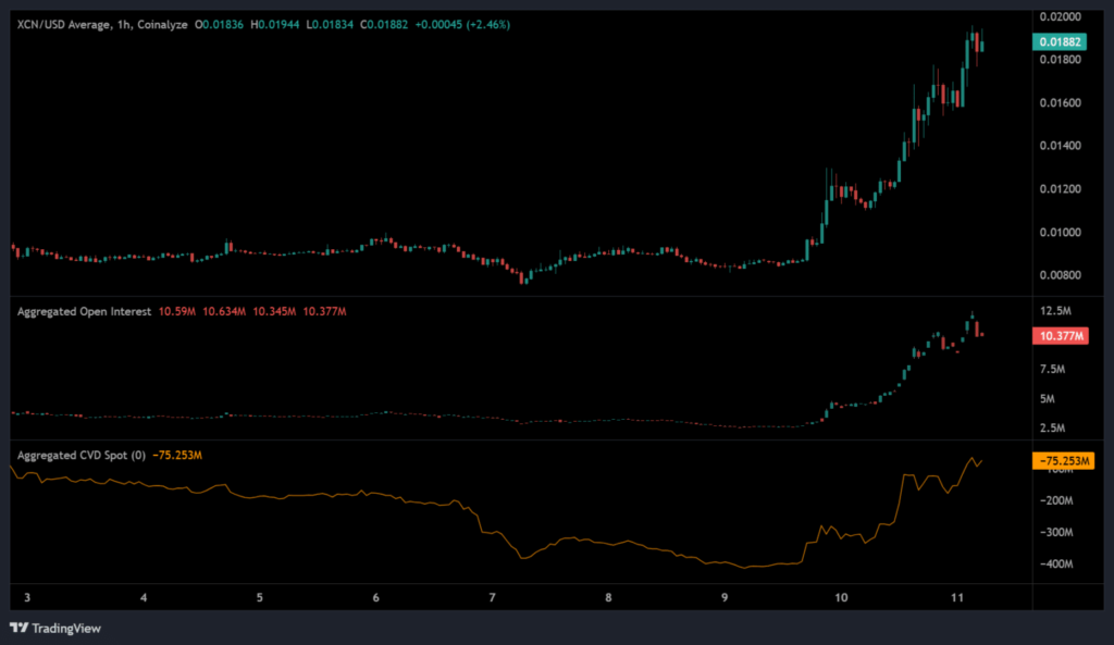A key strength of XCN’s rally lies in its foundation — a rise in both spot market demand and derivatives activity. The increase in CVD Spot and Open Interest (OI) points to healthy organic interest rather than overleveraged speculation, reducing the risk of sharp liquidations.