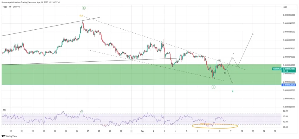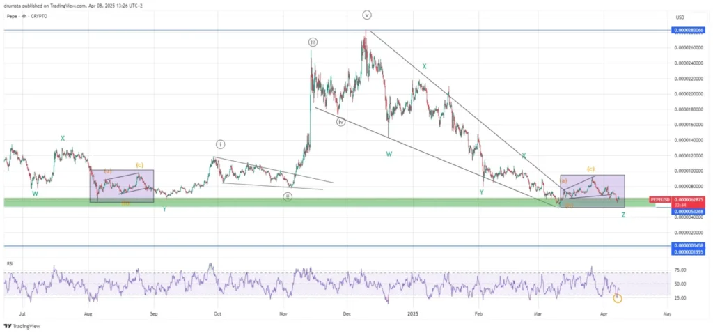 The 4-hour chart reveals that PEPE’s primary five-wave impulse concluded at $0.000028 on December 9. Following this, the price entered a prolonged downtrend, forming a complex W-X-Y-X-Z corrective structure within a descending triangle. This correction culminated at a low of $0.0000052 on March 11, marking a potential bottom for PEPE.
