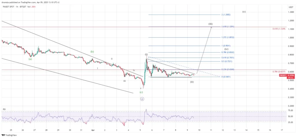 Short-term analysis shows a potential bullish wave (iii) forming, with PI consolidating between $0.54 and $0.60 in a corrective wave (ii). A breakout above $0.626—coinciding with the 0.236 Fib level—could trigger a fresh surge. Fibonacci extensions place wave (iii) targets at $0.904 (1.0), $1.00 (1.272), and $1.13 (1.618).