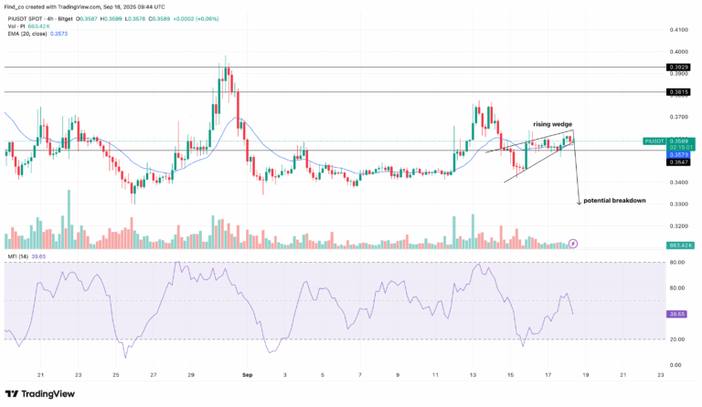 Technical indicators suggest PI faces significant hurdles. The 20-day Exponential Moving Average (EMA) continues to cap recovery attempts, while the Money Flow Index (MFI) points to declining buying pressure. Additionally, PI is forming a rising wedge pattern, a bearish signal that could trigger further declines if selling intensifies. On the upside, immediate resistance sits near $0.38, but momentum remains weak.