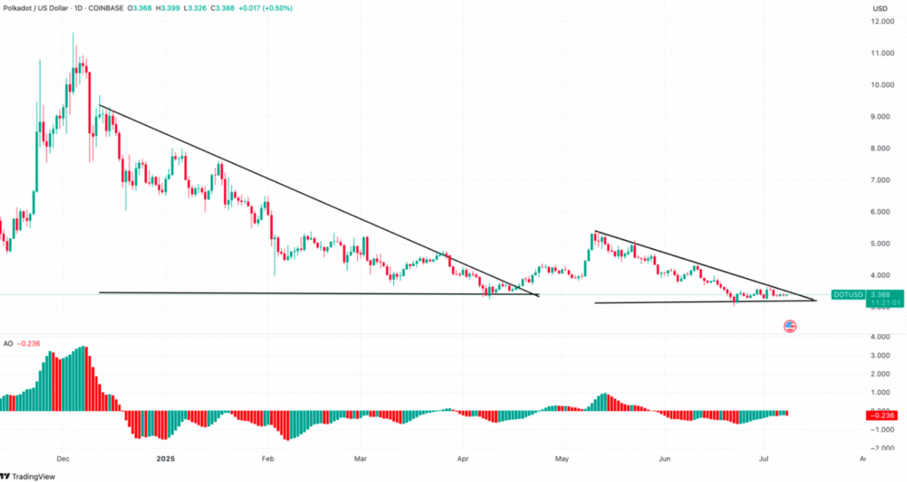 The Awesome Oscillator (AO), a measure of market momentum, has slipped into negative territory, indicating rising bearish pressure. At the same time, DOT’s daily chart is forming a falling triangle pattern, typically a continuation of downward trends. This setup suggests that unless a reversal pattern forms soon, further declines may follow.