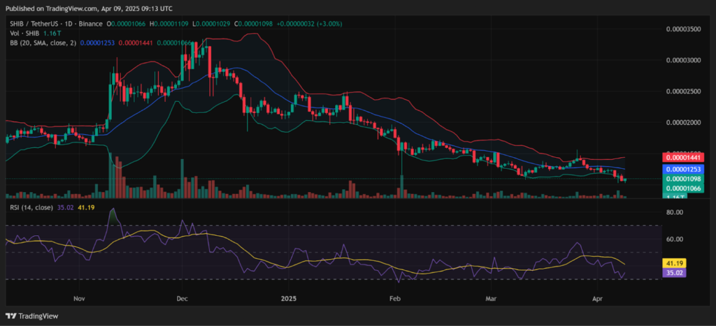As of writing, SHIB trades at $0.00001096, per CoinMarketCap, encountering resistance at the 20-day Exponential Moving Average (EMA) near $0.00001222. Technically, the token is consolidating just above the lower Bollinger Band (BB) at $0.00001066, with the middle band at $0.00001253 acting as a pivotal resistance.