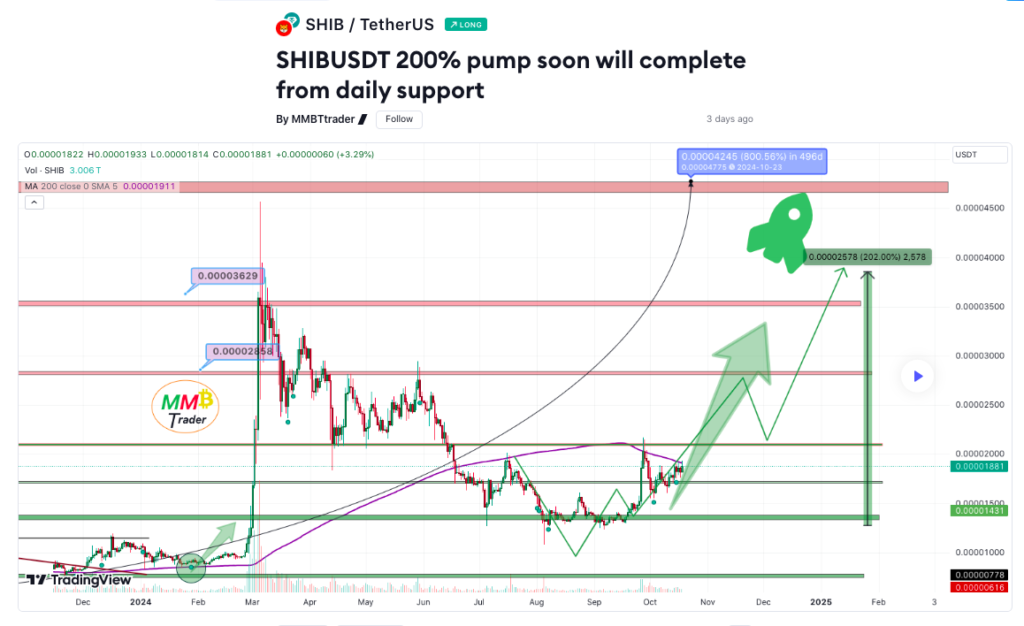 MMBTtrader’s analysis on TradingView outlines a scenario where Shiba Inu could reach $0.0000379. The analyst believes that SHIB has already seen a substantial surge from a support level of $0.000011, and this upward momentum could continue.
