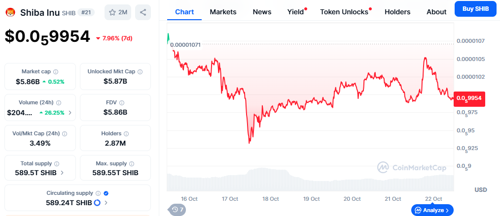 Shiba Inu (SHIB) has staged a dramatic comeback, climbing over 53% from last Friday’s lows to reach $0.000010. The meme coin’s resurgence reflects strong bullish sentiment sweeping the crypto market, fueled by whale accumulation and technical indicators pointing toward further upside.