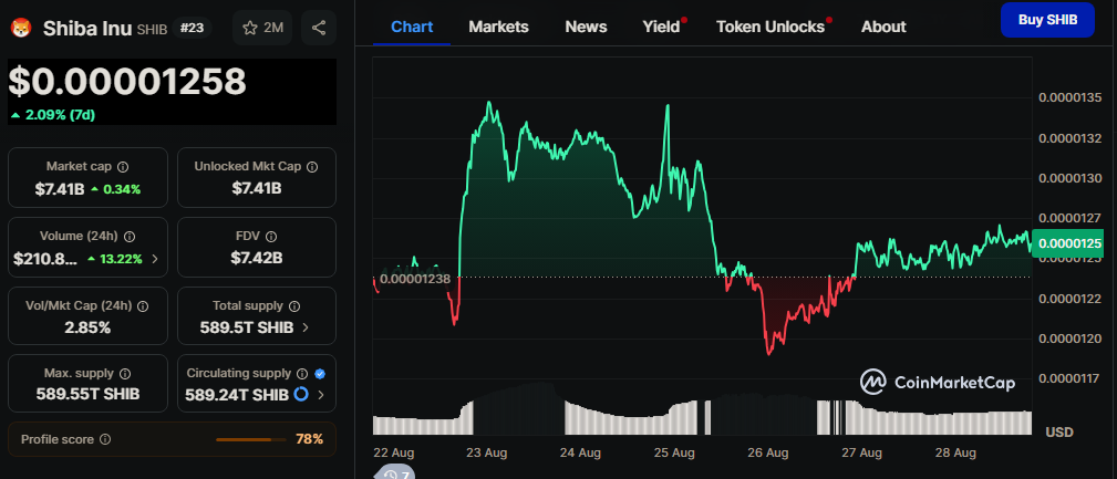 On August 25, SHIB rebounded off $0.000012, marking its fifth bounce from this level since July. Around 20 trillion tokens were stacked, solidifying a short-term floor. Still, the $0.000015 ceiling remains untested, with three failed break attempts pushing price back to support.