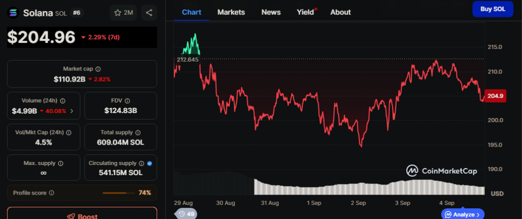 Currently, Solana trades at $206.8, moving within an intraday range of $206.2 to $212.4. The altcoin continues to follow an ascending pattern of higher lows, with the $197–$200 zone acting as crucial support. On the upside, resistance between $215–$220 represents the next major hurdle. Analysts suggest that a successful breakout above this range could open the path to $236–$252, with some projections even targeting $260 if strong trading volumes persist.